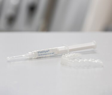Gel mit 16 Prozent Carbamidperoxid (16 Prozent Carbamidperoxid entsprechen 5,8 Prozent Wasserstoffperoxid), welches nach zahnärztlicher Beratung mit der individuellen Schiene einfach und komfortabel zu Hause angewendet werden kann.