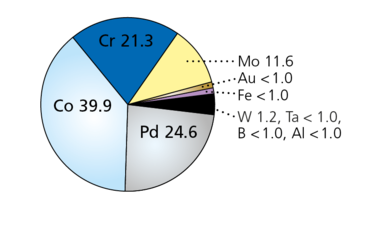 Composition (%):  Co 39.9 | Cr 21.3 | Pd 24.6 | Mo 11.6 | W 1.2 | Fe <1.0, Ta <1.0, B <1.0, Au <1.0, Al <1.0