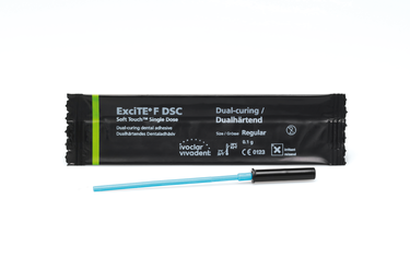 ExciTE F DSC – Dual cure Single Component – is a dual-cure, fluoride releasing adhesive which is used in combination with the total-etch technique. ExciTE F has been further designed for clinical cases where light cannot be used for curing (e.g. in the cementation of endodontic posts or indirect restorations) or in which chemically curing composites are employed.