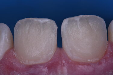 Following topical anaesthesia application for 90 seconds and application of 1.4 carpules of a 2% Lignocaine with 1:100,000 epinephrine solution (Septodont) via buccal infiltration, the region was isolated with a split rubber dam with clamp anchors on the upper E’s (CPT_2087). The old restorative material was removed, and the hypomineralized region conservatively reduced to expose an improved amount of inorganic substrate for bonding. It was noted that there were hypomineralized regions in both the middle and incisal thirds of both 11 and 21. A partial thickness oblique fracture was noted in the enamel but did not penetrate to the palatal surface.